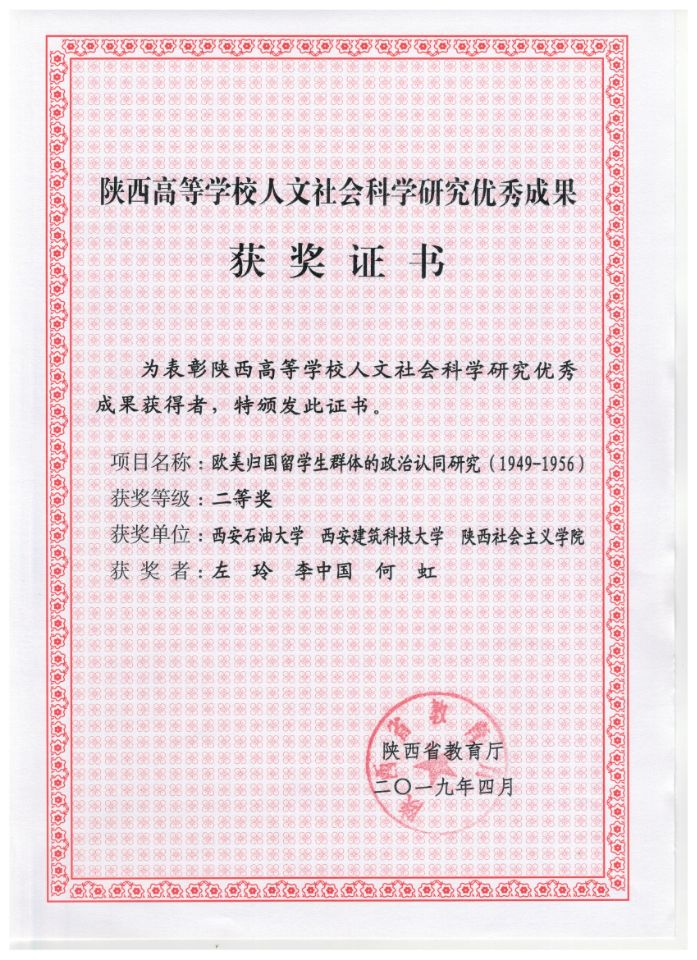 2019年陕西高等学校人文社会科学研究优秀成果三等奖(左玲)