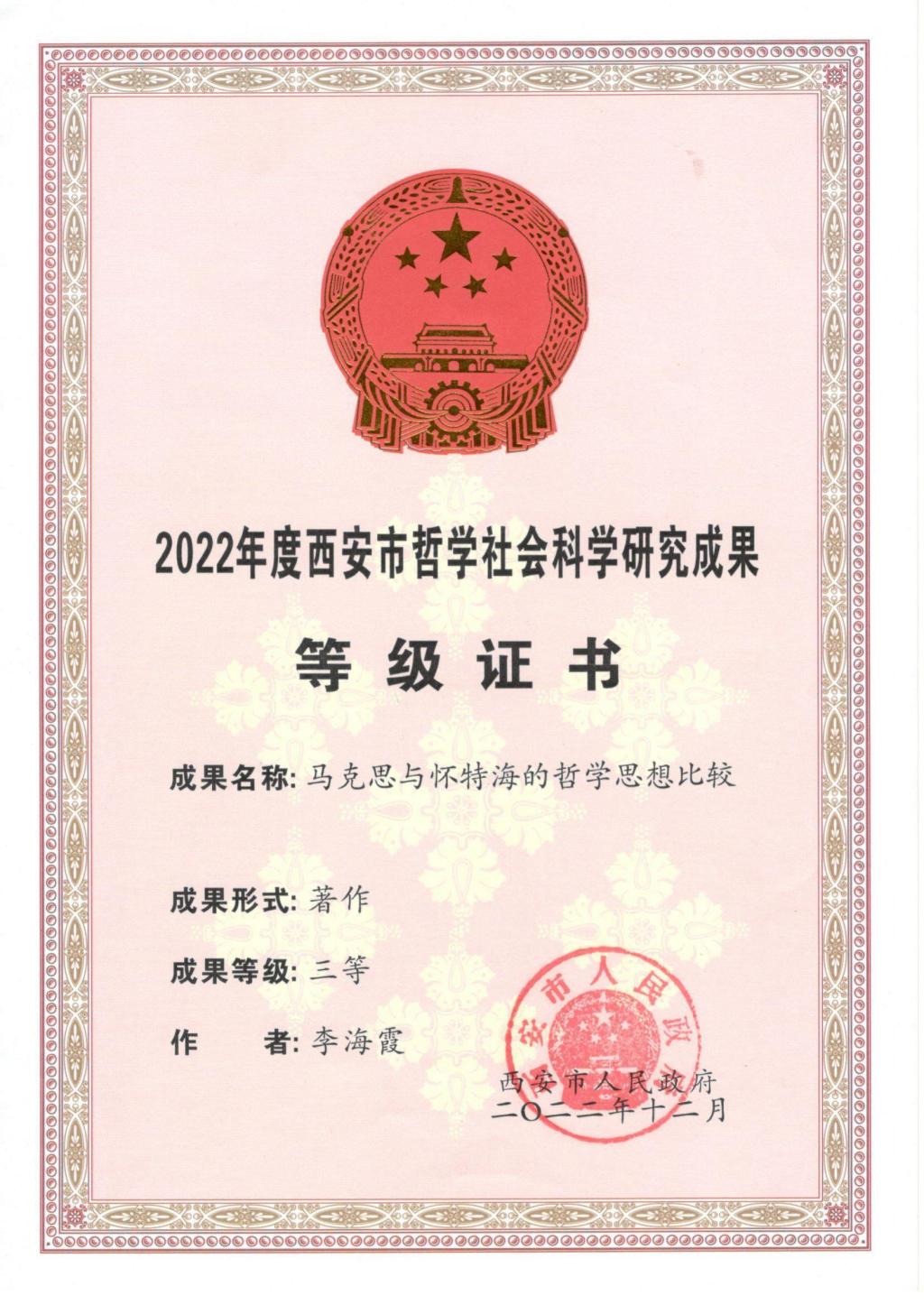2022年度西安市哲学社会科学研究成果三等奖(李海霞)