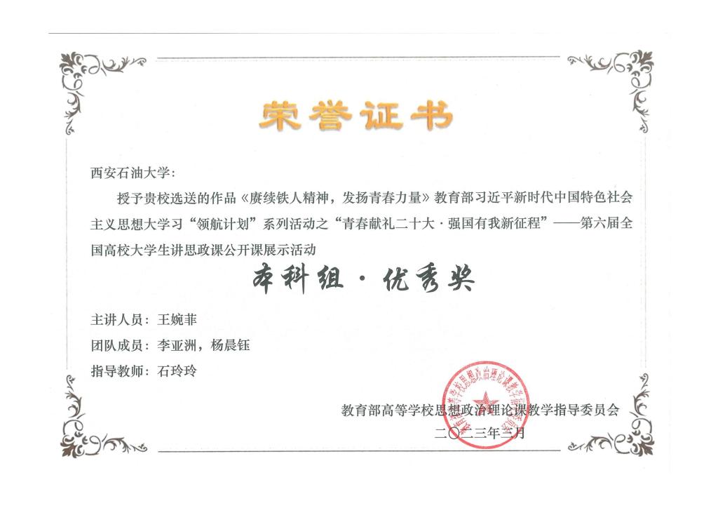2022年第六届全国高校大学生讲思政课公开课展示活动本科组优秀奖(王婉菲)