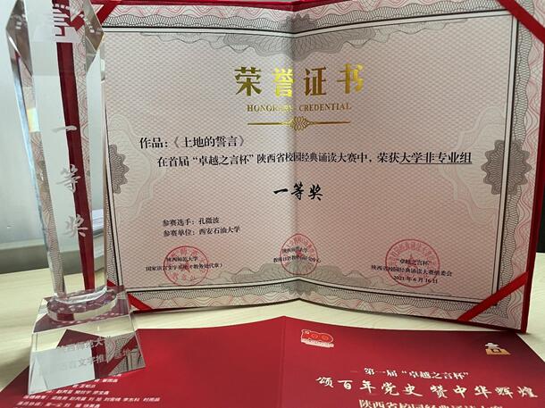 2020级研究生孔微波在陕西师范大学(长安校区)参加了“卓越之言杯”陕西省首届校园经典诵读大赛线下展演暨颁奖典礼并获得大学非专业组一获奖。