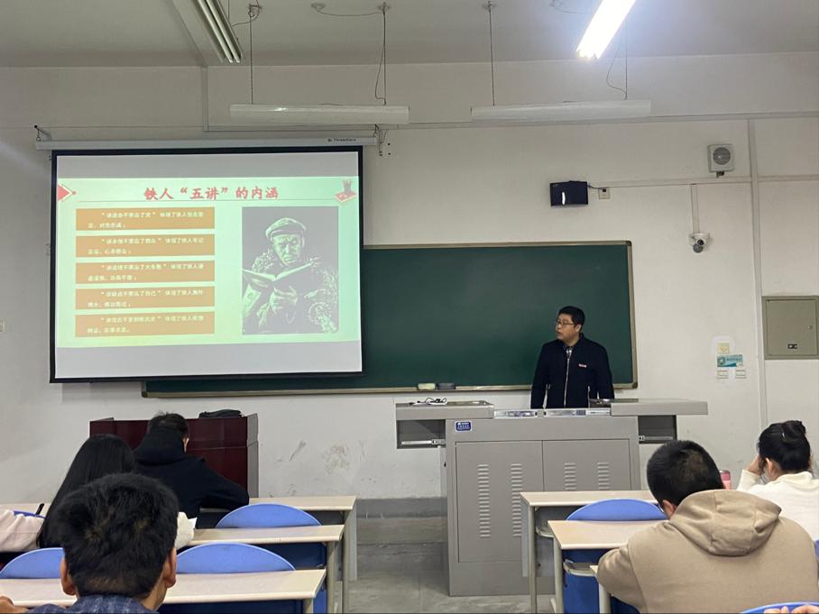 党总支书记张伟为同学们讲授了《铁人“五讲”的时代价值和现实意义》专题讲座。张书记主要从铁人“五讲”的来历、内涵及时代价值和现实意义出发,为大家生动解读了铁人王进喜“讲进步不要忘了党、讲本领不要忘了群众、讲成绩不要忘了大多数、讲缺点不要忘了自己、讲现在不要割断历史”。“铁人五讲”反应了铁人王进喜看待成长进步、对待人民群众、对待荣誉地位、对待批评与自我批评,如何处理过去、现在的关系等观点朴素的哲学观点。对同学们理解铁人精神的丰富内涵、社会影响及当代价值提供了一把钥匙。其次,张书记明确指出不管是过去、现在、还是将来,铁人“五讲”都永不过时,对于我们每个人都有现实指导意义。铁人精神时刻提醒着我们,马克思主义的理论旗帜、中国特色的社会主义道路、全心全意为人民服务的宗旨就是我们共产党人的精神支柱。最后,他号召同学们向铁人学习,充分利用好红色资源、发扬好红色传统、传承好红色基因,成为德智体美劳全面发展的社会主义合格建设者和可靠接班人。