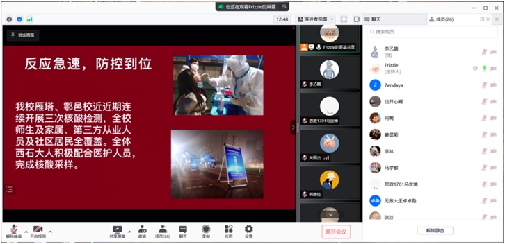 会议第一项,主持人就疫情期间同学们如何做好宿舍、图书馆及个人防护;封校管理期间如何安排学习生活;如何做好心理建设、调整心态,积极应对疫情三个方面进行了分享。并宣传了学校在面对疫情“大考”时,反应迅速、防控到位,物资保障充足,有序组织两校区全员核酸采样等工作情况。