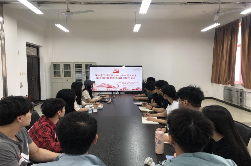 研究生第一党支部在鄠邑校区崇文楼325会议室召开会议,专题学习习近平总书记在中国人民大学考察时重要讲话精神,会议由党支部宣传委员刘笑含主持,支部全体党员、积极分子参加。