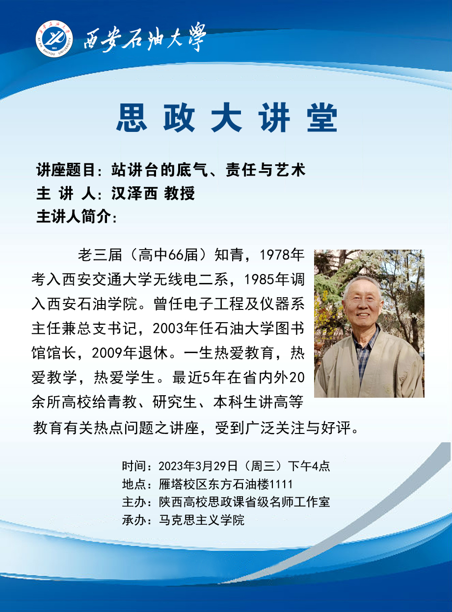 思政大讲堂“站讲台的底气、责任与艺术”专题讲座在雁塔校区东方石油楼1111室举行,汉泽西教授应邀主讲。腐漫画