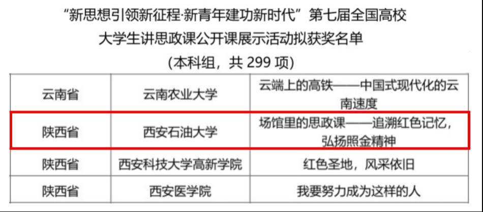 承办的习近平新时代中国特色社会主义思想大学习领航计划主题教育活动——第七届全国高校大学生讲思政课公开课展示活动评选结果公布,我院报送的作品《场馆里的思政课——追溯红色记忆,弘扬照金精神》(主要参与人:姬祥飞、朱鑫鑫、汪雪洁)荣获本科组三等奖。