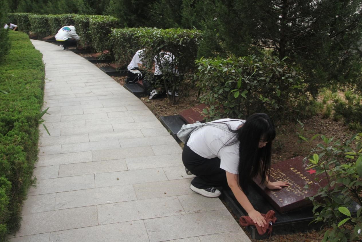 活动第三项,全体师生擦拭陵园烈士墓碑。大家怀着崇敬的心情,徒手清理墓碑周围的杂草和垃圾,认真擦拭所有烈士墓碑,让墓碑一尘不染,以此来表达对烈士伟大精神的深切思念和缅怀。