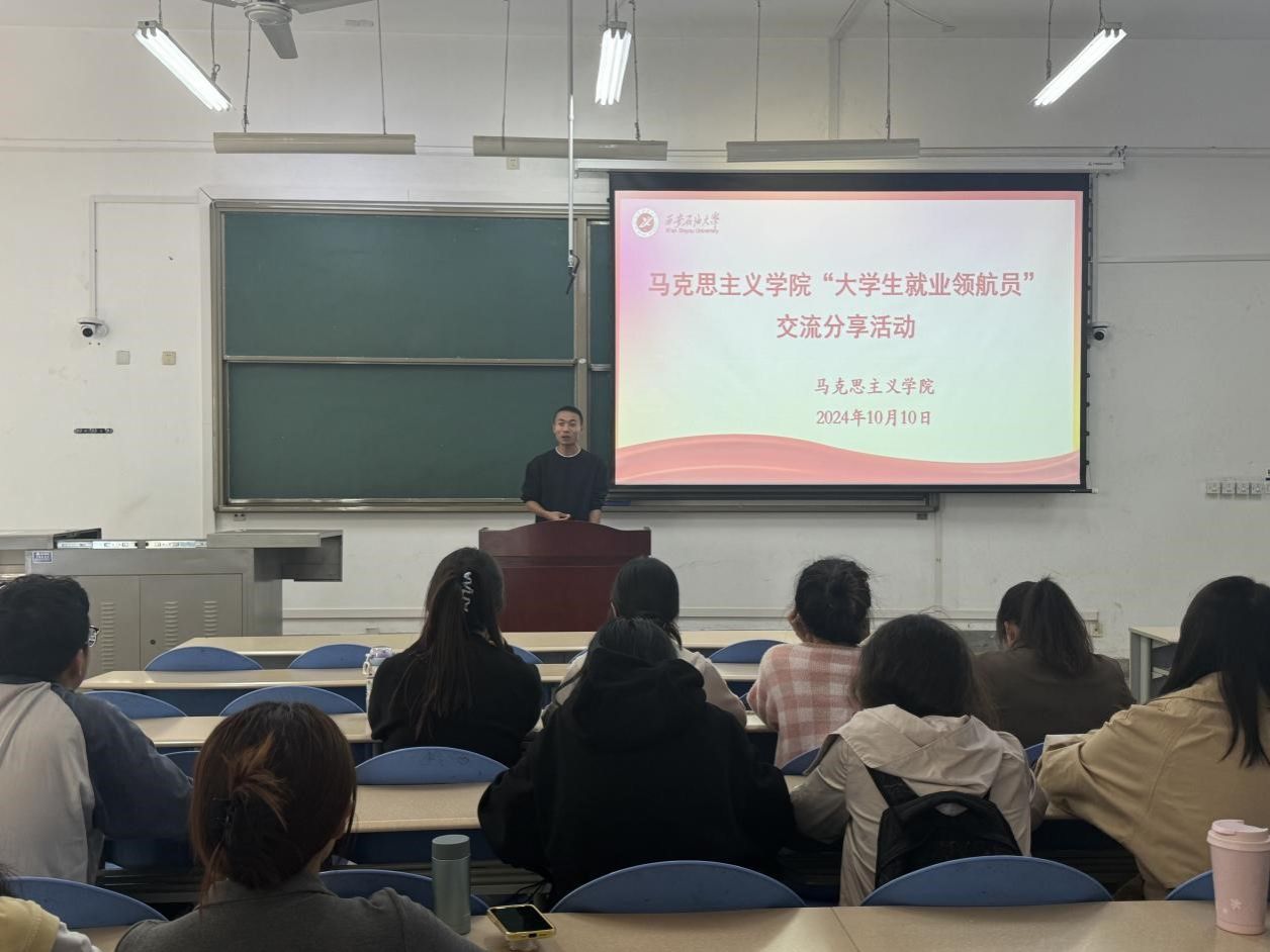 在鄠邑校区博览楼108教室举办“大学生就业领航员”交流分享活动。研究生第二党支部书记肖贤同学应邀为研究生作求职经验交流分享。学院研究生代表参加交流活动,活动由研究生代表阴鸣主持。