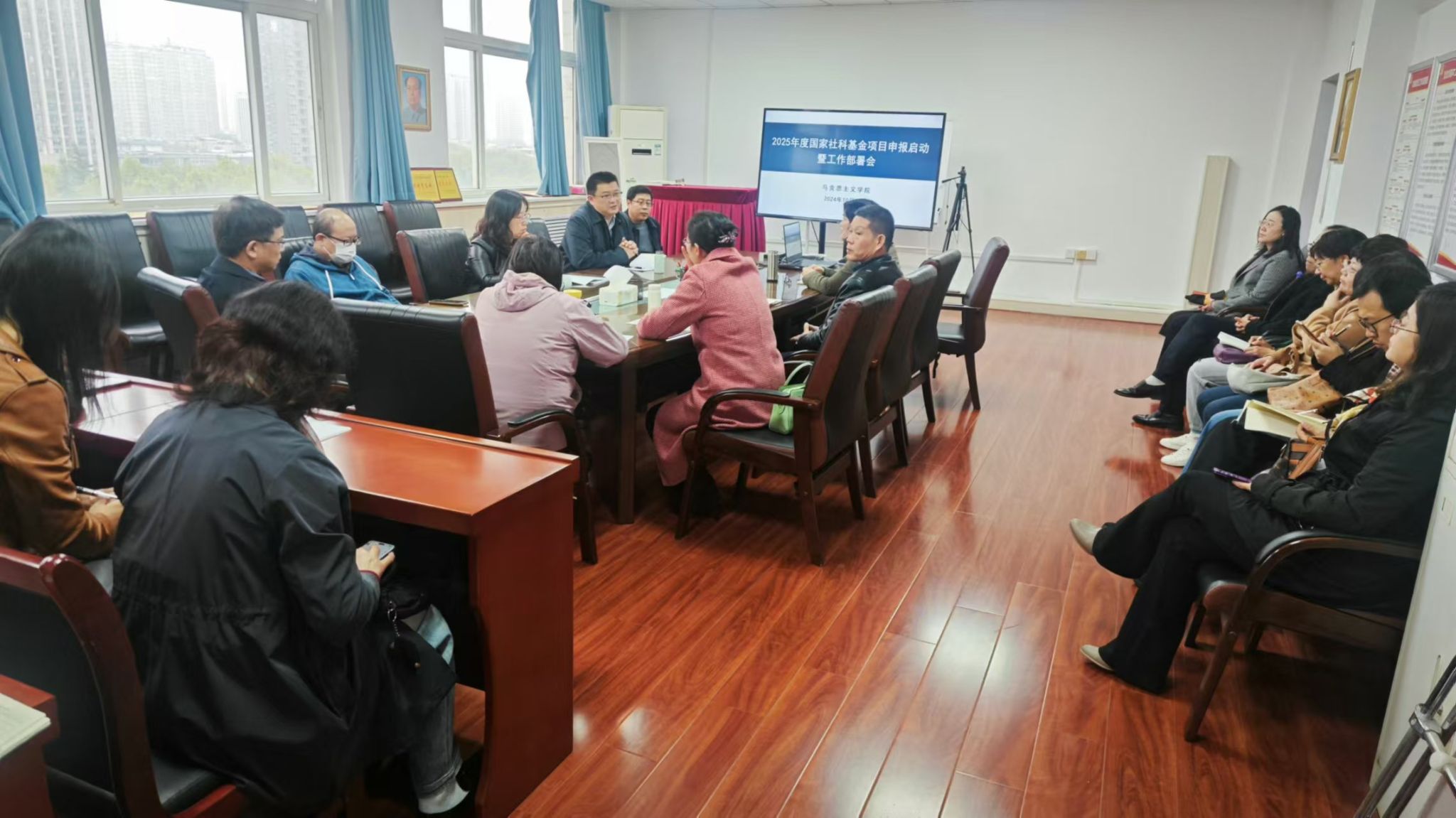在雁塔校区华油能源楼818会议室召开2025年度国家基金项目申报启动暨工作部署会,学院党总支书记张伟,院长张海涛,党总支副书记袁通路,副院长郭艳英,副教授、青年博士代表及往年国家社科基金项目主持人等二十余人参加会议,会议由郭艳英副院长主持。