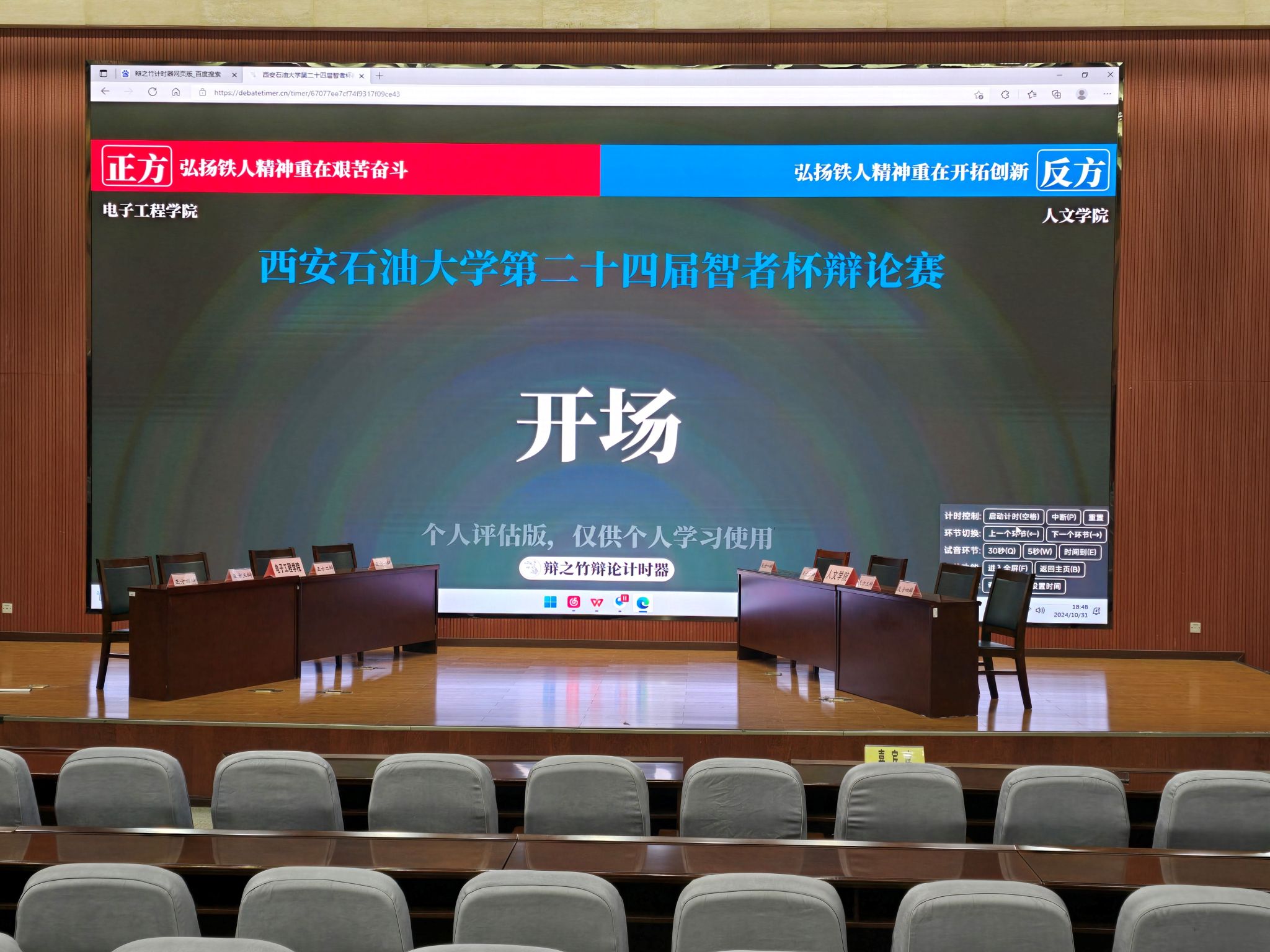 10月31日晚,第二十四届“智者杯”大学生辩论赛决赛在鄠邑校区弘石学术报告厅开启。校党委副书记张木出席并致辞,相关部门、学院负责人莅临现场。张木指出学校始终坚持石油精神办学、铁人精神育人、延安精神铸魂的办学理念,“智者杯”辩论赛决赛引入铁人精神辩题是我校积极构建铁人精神特色育人体系、打造鲜明“铁人思政”品牌的有益实践。他强调学校将铁人精神作为大学生成长成才的重要思想引领和精神力量支撑,将其贯穿教育教学始终,让铁人精神迸发出更强大的精神力量,为“四实一新”人才的培养供坚强有力的支撑。