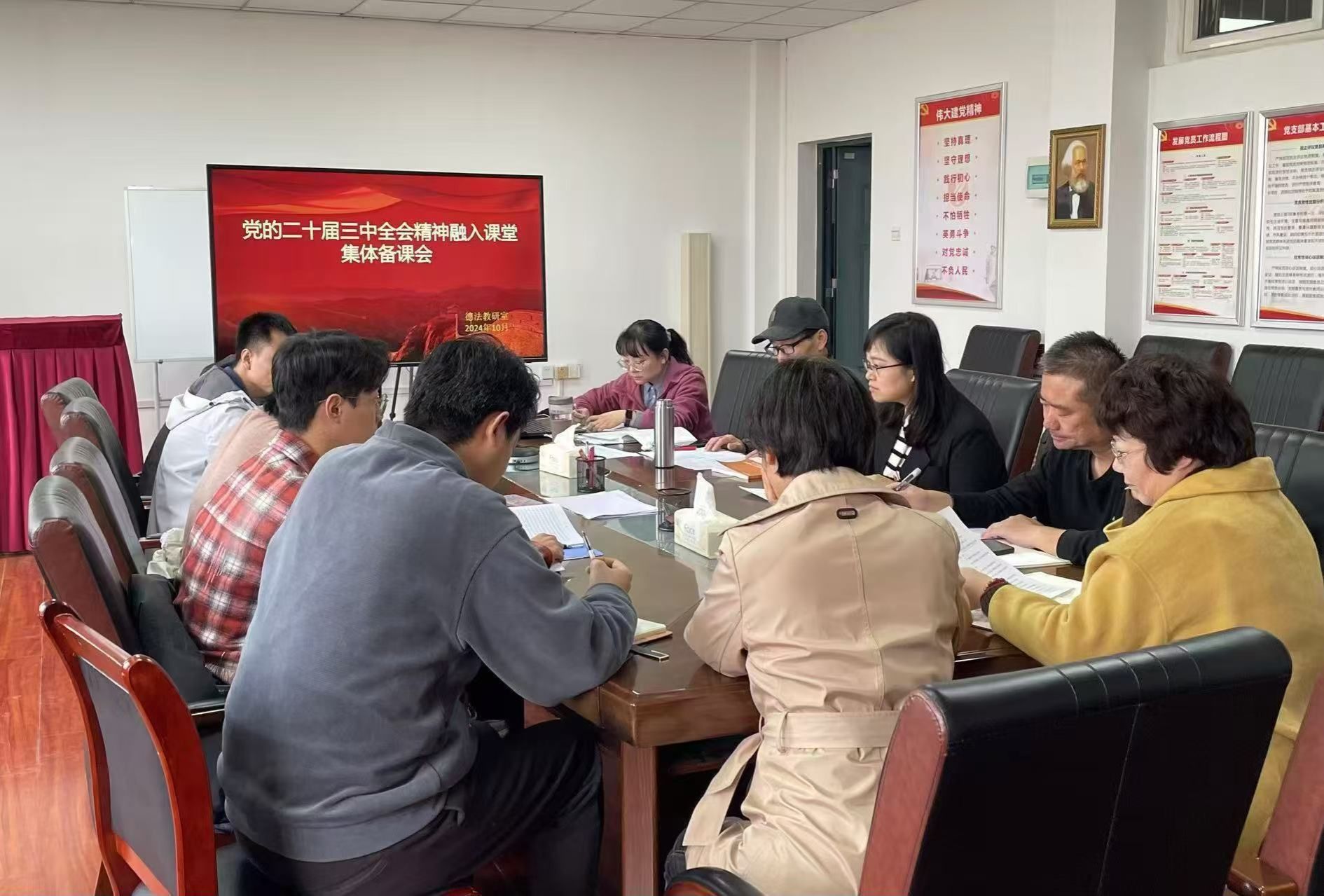 为深入学习和贯彻党的二十届三中全会精神,进一步提升思政课教学质量,思想道德与法治教研室于10月25日召开集体备课会。备课会由教研室主任石玲玲主持,本学期承担思想道德与法治课程教学的无课教师参加了本次会议。